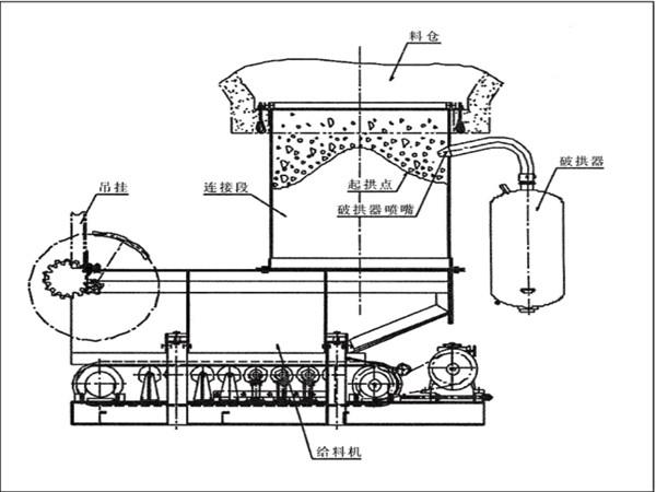 自動破拱給料機為了防止在給料機距離倉口較高的時候,連接段內(nèi)的物料壓實粘結(jié)成拱或粘壁,使物料不能從連接段內(nèi)排出或減少連接段的有效容量,因此采用了在連接段上安裝PF系列破拱器。自動破拱給料機利用壓縮空氣時瞬間產(chǎn)生的爆破力,對物料產(chǎn)生爆破、切割效應(yīng),以達到良好的疏通效果。
