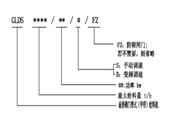 扇形閥門帶式(甲帶)給料機(jī)型號(hào)說明: